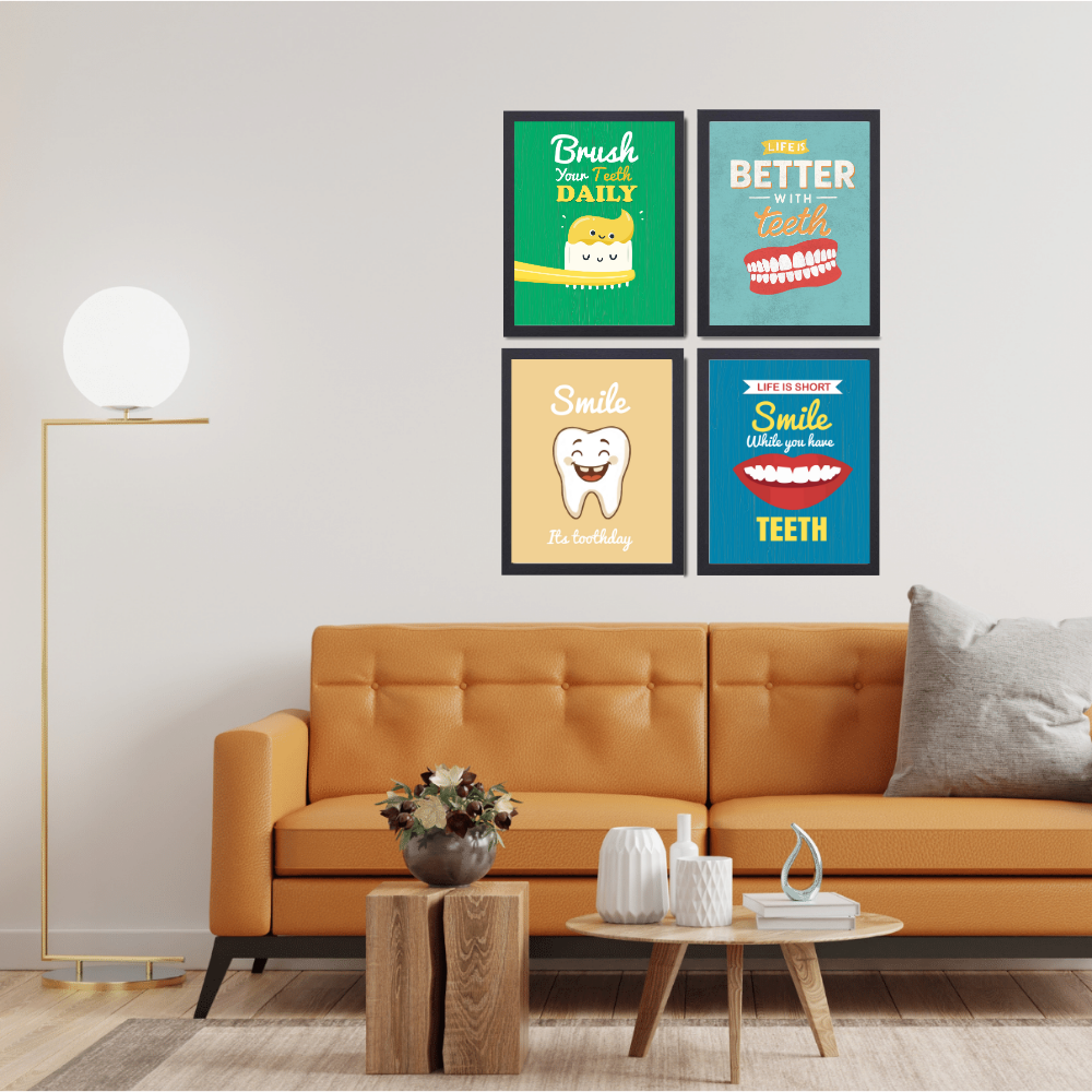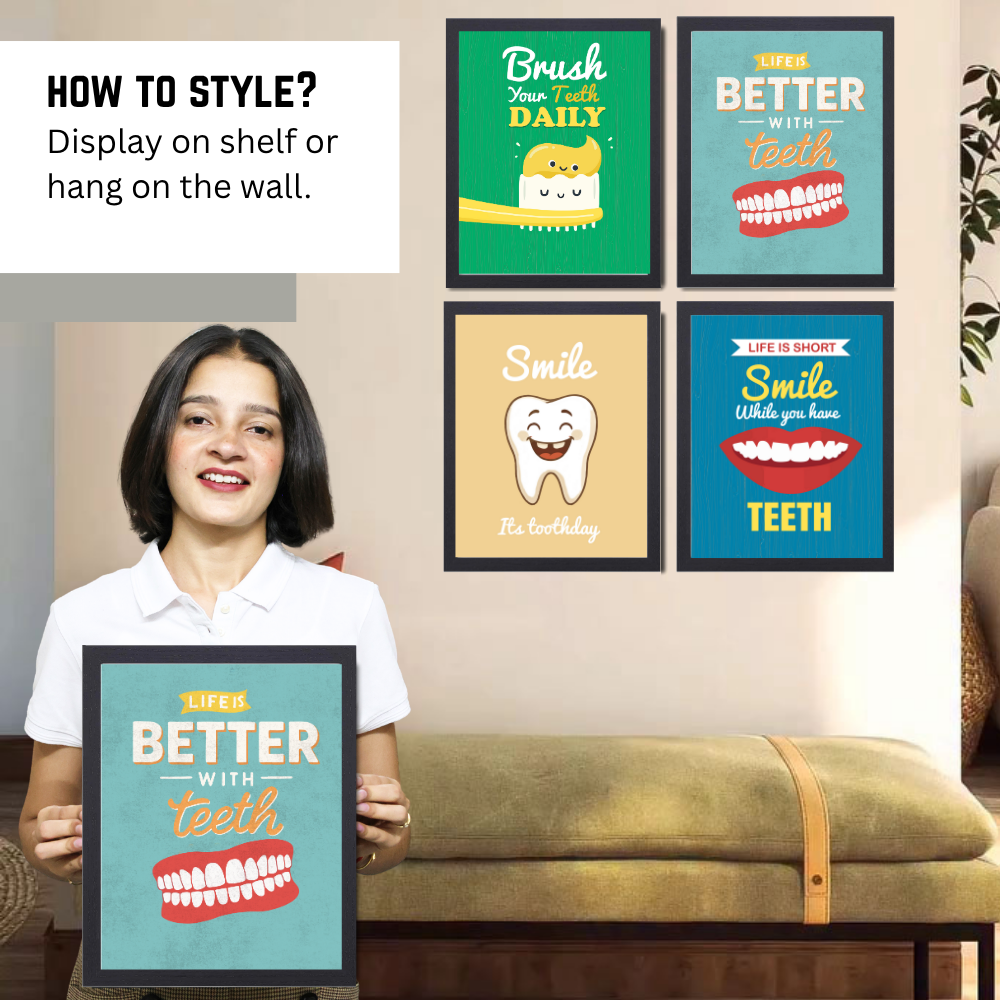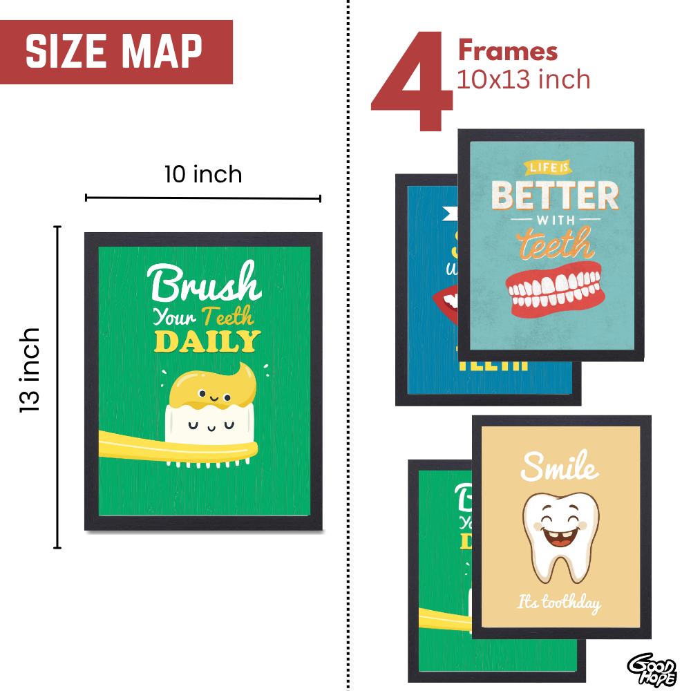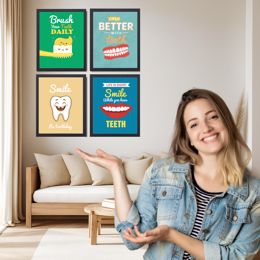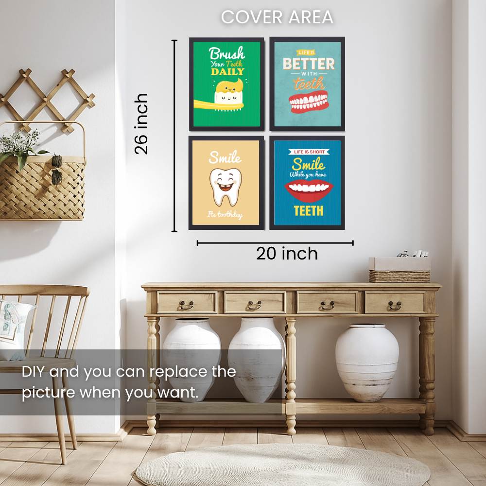 Dentist Funny Quote Wall Frames for Dental Clinic, Set of 4 Photo Frame for Hospital, With Hanging Hook | Brush Framed poster Pictures for Wall Decoration
